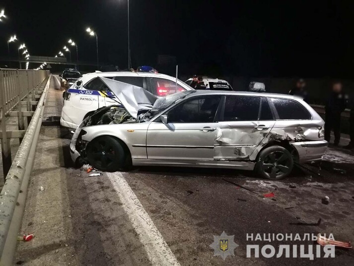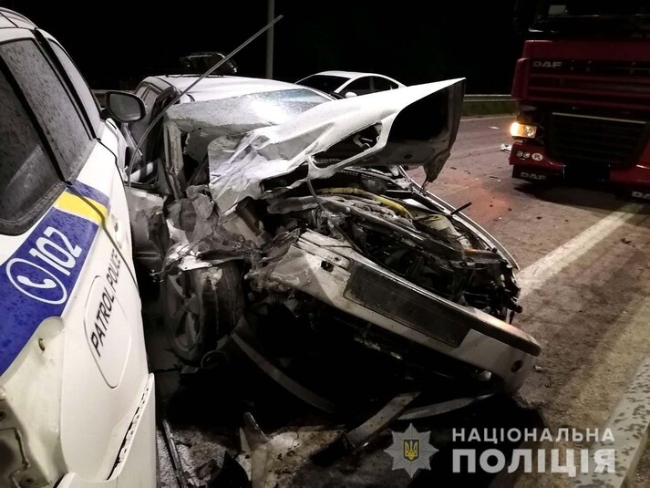 «Поліцейські попередньо встановили, що 21-річний водій «BMW330» – житель села Горбаків, грубо порушуючи правила дорожнього руху, намагався проїхати між двома попутними автомобілями, які рухалися у правій та лівій смугах, та допустив зіткнення спочатку із вантажівкою «DAF», а потім із службовим автомобілем «Mitsubishi Outlander», – розповіли у поліції.