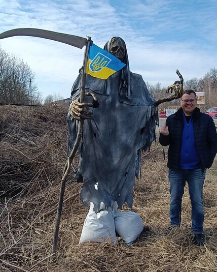 На одному з блокпостів на території України встановили «скульптуру» смерті з косою. Фото на своїй сторінці у Facebook опублікував директор видавництва «Саміт-Книга» Ігор Степурін.