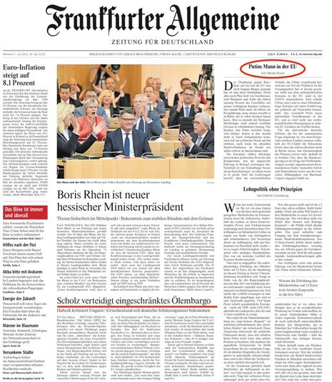 FAZ: «Людина Путіна в ЄС». Нафтове ембарго проти Росії, про яке домовився ЄС після довгої боротьби, є жорстким заходом. Якщо все піде за планом, до кінця року Росія втратить 90% бізнесу зі своїми ключовими клієнтами. Це не позбавляє Путіна коштів на ведення війни; він платить за власну армію рублями, які може надрукувати сам. Але це знову позбавляє московську правлячу еліту значної кількості західної валюти. Пиріг, який може роздати Путін, дедалі менше. Якщо він не зможе компенсувати втрати в Азії, політичний тиск на нього посилюватиметься, навіть якщо нинішній баланс сил у Кремлі важко зрозуміти ззовні.