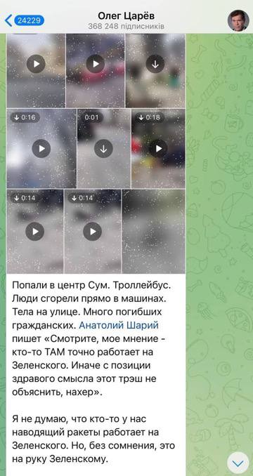 Колаборант, екснардеп Олег Царьов погоджується, що удар по центру Сум балістикою виходить за межі здорового глузду. Проте він заперечує, що хтось з росіян працює на Україну і Зеленського...