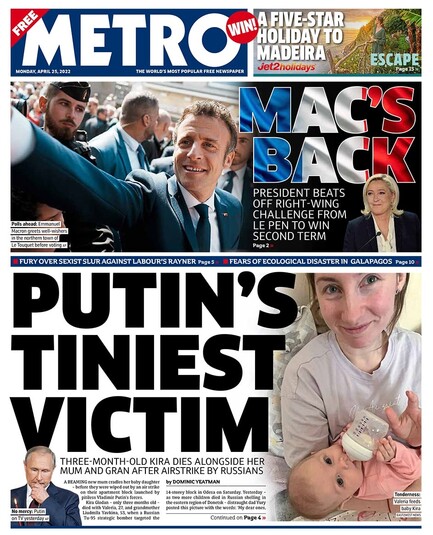 Фотографія матері та дитини, убитих в українській Одесі у суботу, домінує на першій шпальті Metro. 27-річна Валерія Глодан і тримісячна Кіра перебували в 14-поверховому багатоквартирному будинку, коли по ньому було завдано удару російської авіації. Заголовок говорить: «Найменша жертва Путіна».