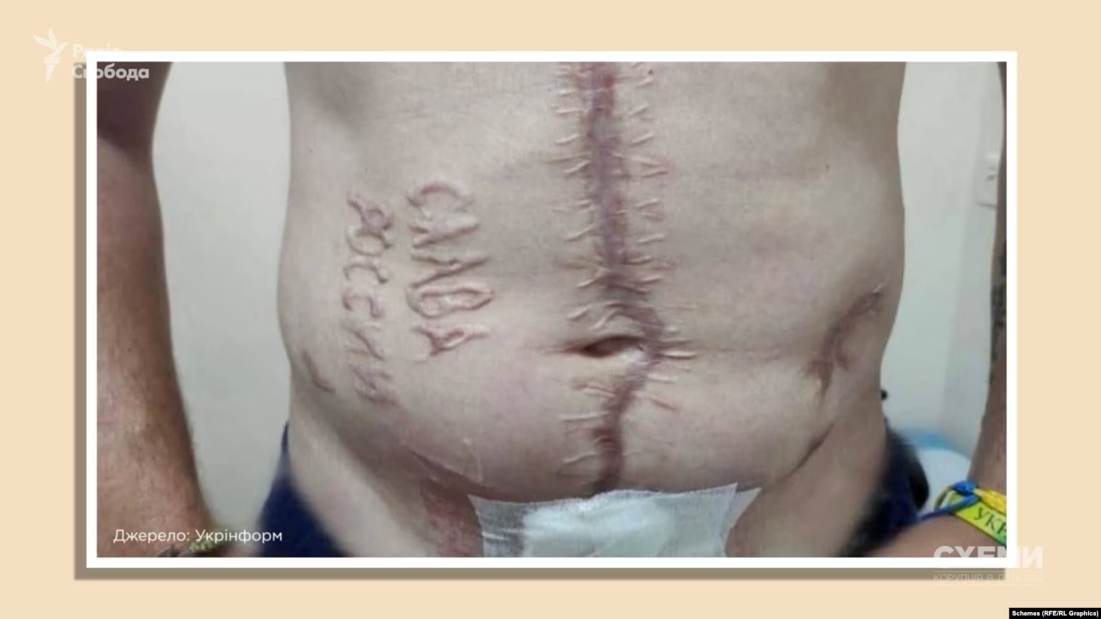 Напис на животі боєць помітив лише через кілька днів, коли зміг підняти голову. Він також чув, як медперсонал у іншій лікарні Донецька говорив, що операцію проводив «російський лікар».