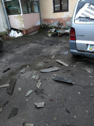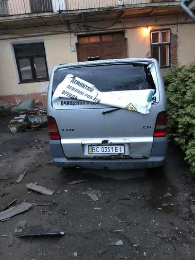 По вулиці Джерельній сильний вітер зірвав шифер, цеглу та різне перекриття з будинку, яке впало на припаркований автомобіль і пошкодило його.