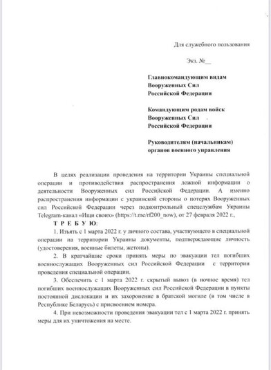 Командування російських окупаційних військ видало наказ, згідно з яким у солдатів були відібрані документи. Також наказується таємно евакуювати тіла ліквідованих до пунктів постійної дислокації, а в разі неможливості – знищити тіла місці. Про це повідомили в Оперативному командуванні «Північ».