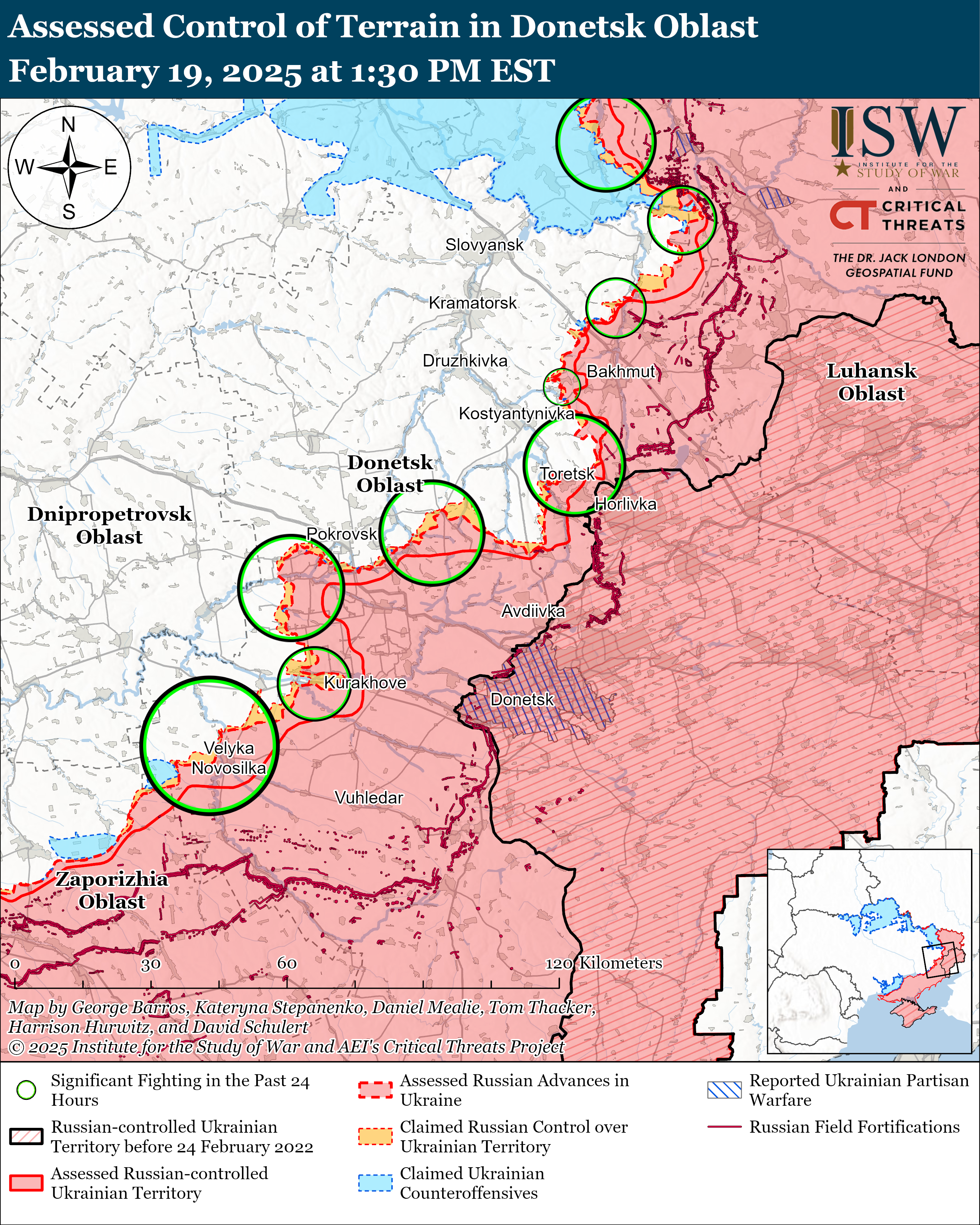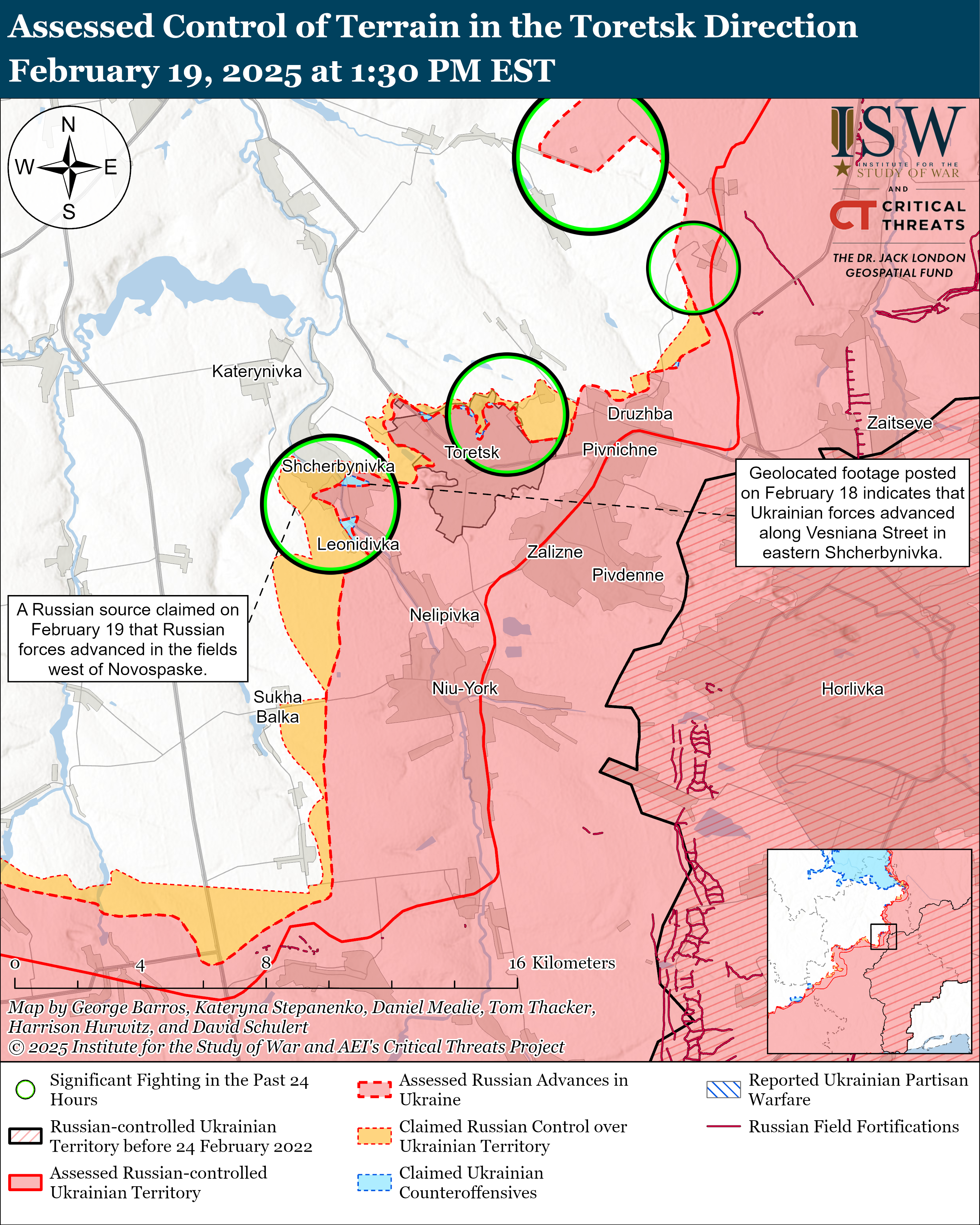 Геолокаційні кадри, опубліковані 18 лютого, показують, що українські сили нещодавно просунулися у східній Щербинівці. ISW не підтвердило, але Росія заявляла: російські війська просунулися на північ від Дружби (на схід від Торецька), у Новоспаське (на захід від Торецька) і на захід від Леонідівки.