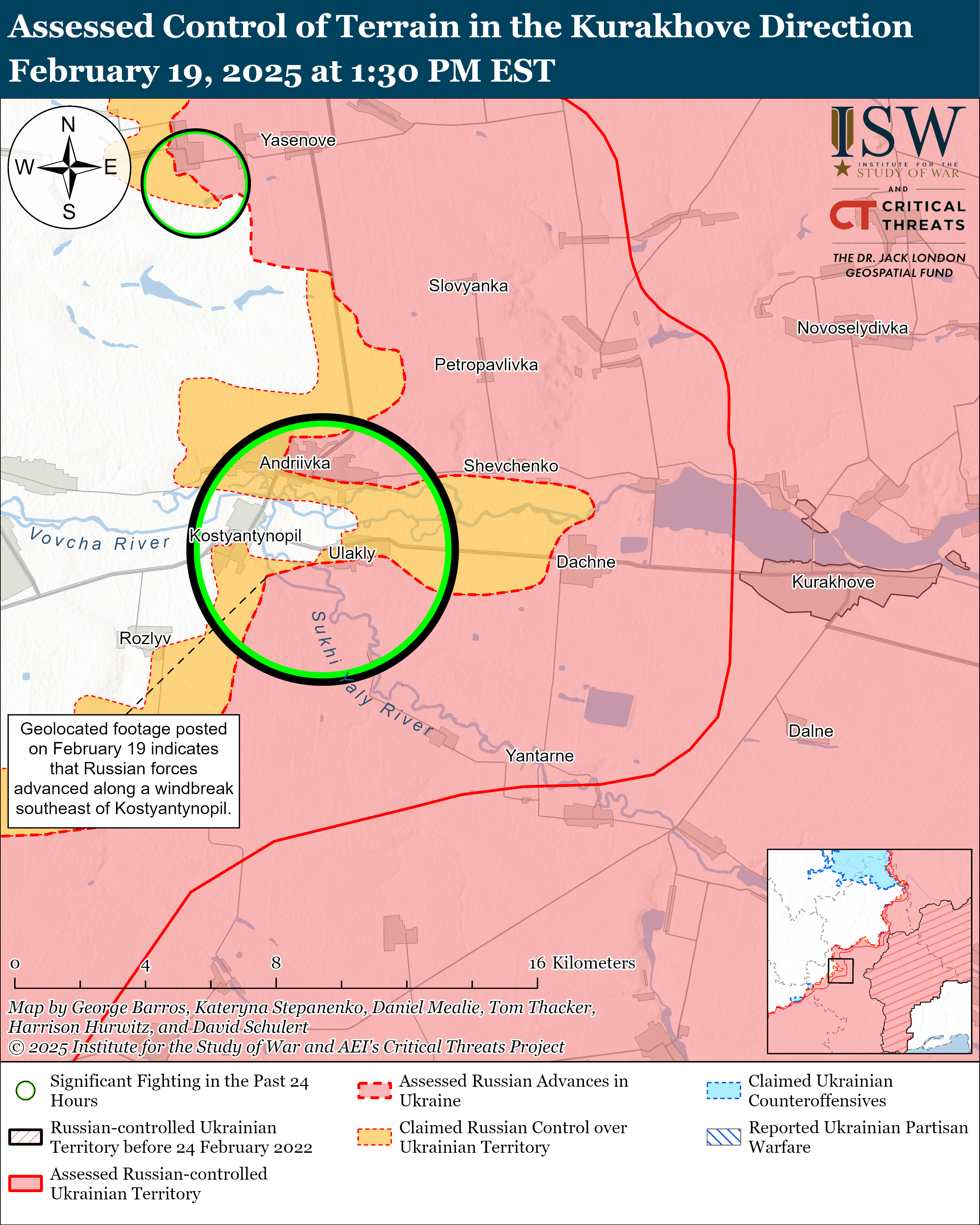 Українські сили просунулися на північний схід від міста Харків. 19 лютого російські війська продовжували обмежені наземні атаки на північний схід від міста Харків поблизу Вовчанська. Геолокаційні кадри, опубліковані 18 лютого, показують, що українські сили нещодавно просунулися в центрі Вовчанська.