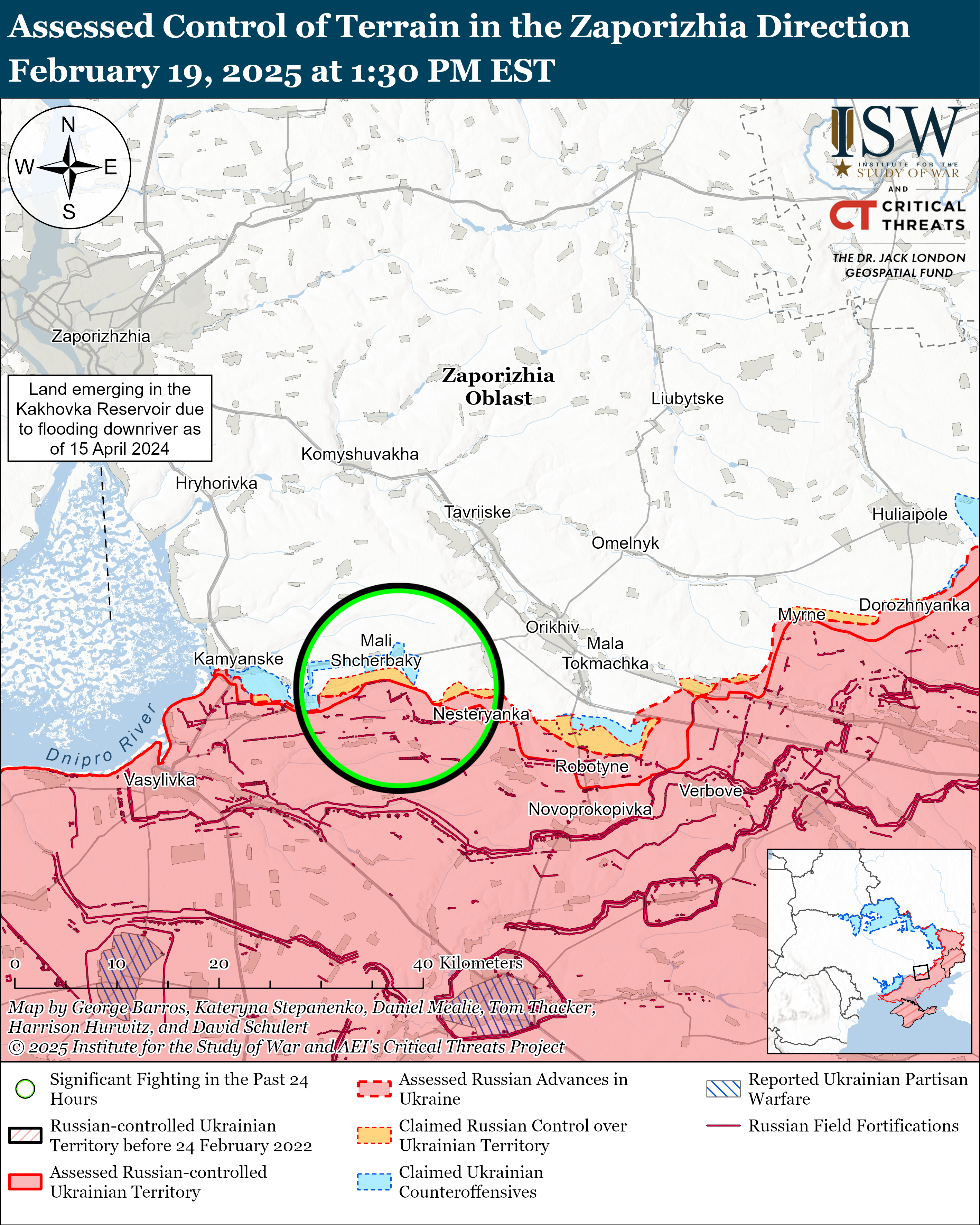 19 лютого російські війська продовжили наземні атаки на заході Запорізької області, але не просунулися. 18 і 19 лютого російські окупанти вели штурм на північний захід від Роботиного в районі Малих Щербаків, Новоандріївки та Степового.