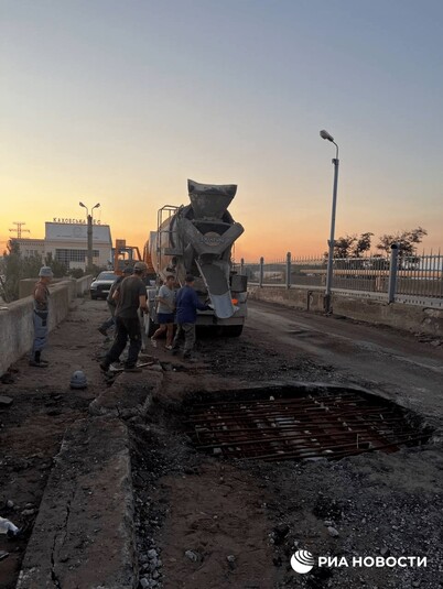 Російські ЗМІ опублікували фото ремонтних робіт на мосту Каховської ГЕС через Дніпро. Видання РІА «Новості» оприлюднило світлини, пояснивши, що триває ліквідація ударів американських ракет Himars.