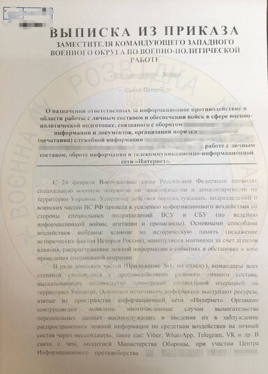 Російське командування скаржиться на посилення інформаційного впливу на російських військових з боку ЗСУ та українських спецслужб (інформаційна війна, агітація, пропаганда). Про це йдеться у «Виписці з наказу заступника командувача західного воєнного округу з воєнно-політичної роботи», яку командування окупантів розіслало у військові частини, повідомляє Головне управління розвідки Міноборони.