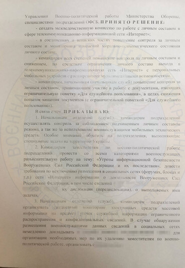 В документі стверджується, що «командири всіх ступенів зіштовхнулись з протидією особового складу», який висловлює невдоволення війною в Україні. На думку російського командування провина за зниження мотивації та панічні настрої військових лягає на мережу Інтернет та популярні месенджери.