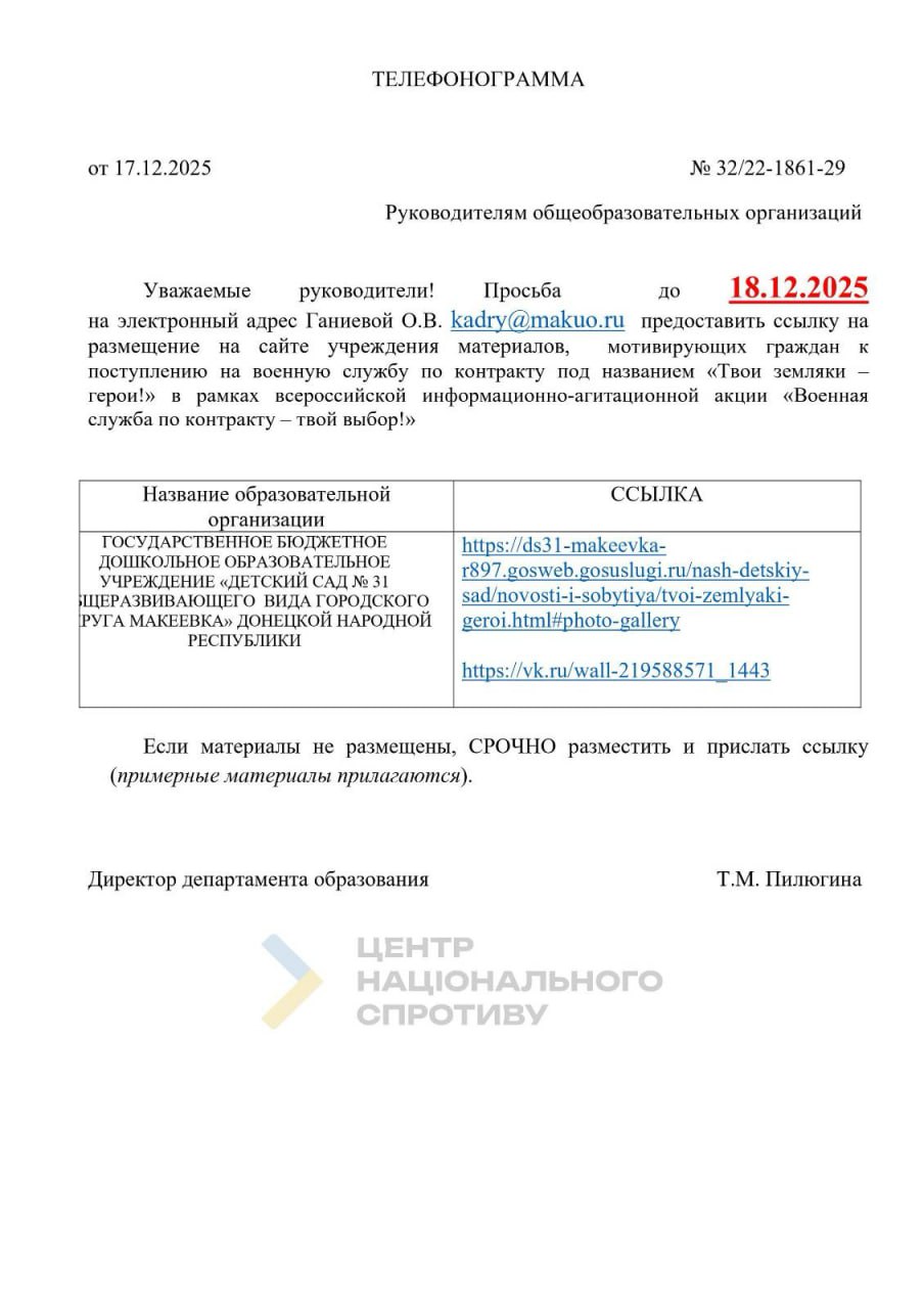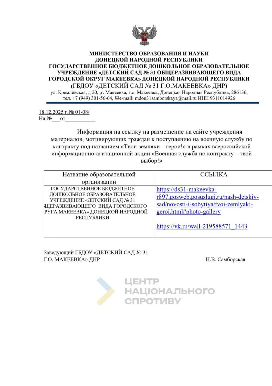 На тимчасово окупованих територіях України зафіксовано факти примусового залучення дошкільних навчальних закладів до пропаганди служби в армії РФ. Згідно з документами, отриманими Центром національного спротиву (ЦНС), окупаційні адміністрації видали прямі вказівки освітнім установам системно розміщувати агітаційні матеріали про контрактну службу, пише «Главком».