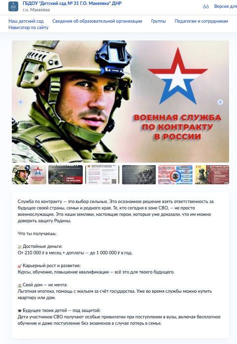 Централізована інформаційна кампанія під назвою «Військова служба за контрактом – твій вибір!» передбачає не лише публікацію контенту, а й обов’язкову звітність перед керівництвом. Як приклад наводиться дитячий садок №31 у Макіївці, адміністрація якого прозвітувала про розміщення пропагандистських постів «Твої земляки – герої!» на своєму сайті та у соціальних мережах.