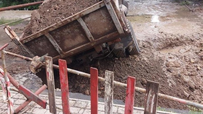 Згодом цей же паблік опублікував фото, де видно, що в покинуту яму провалився самоскид.