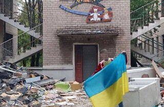 У тимчасово окупованому Маріуполі учасник спротиву сфотографувався на фоні пошкодженого російськими обстрілами дитсадка з розгорнутим національним прапором України. Відповідну фотографію оприлюднив радник Маріупольського міського голови Петро Андрющенко.