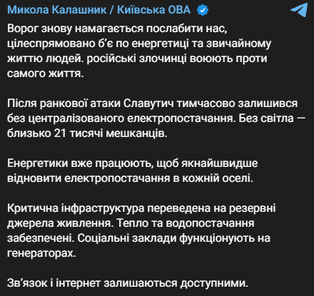 Повідомляється, що після ранкової атаки Славутич тимчасово залишився без централізованого електропостачання. Без світла – близько 21 тисячі мешканців.