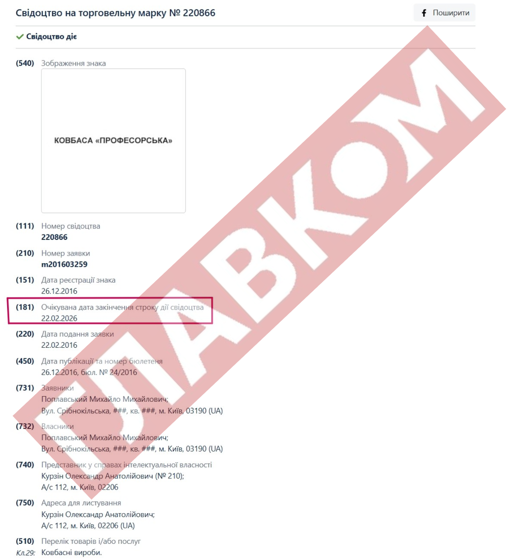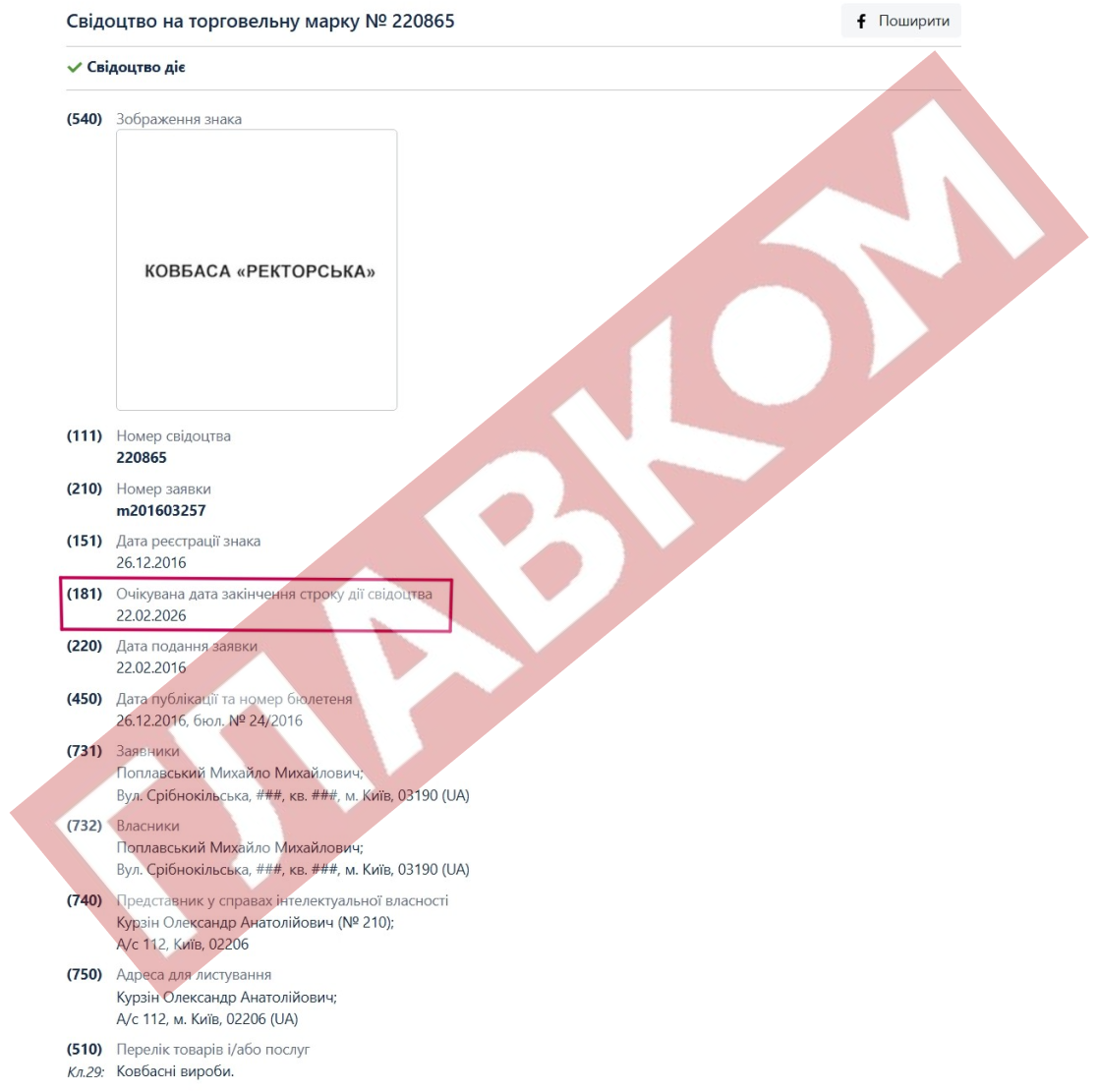 Згідно з документацією, назви, які Михайло Поплавський активно використовував у своєму ресторанному та фермерському бізнесі, скоро не належатимуть йому. Зокрема, 22 лютого 2026 року офіційно закінчується термін дії свідоцтв на такі торговельні марки: «Ковбаса «Ректорська» та «Ковбаса «Професорська».