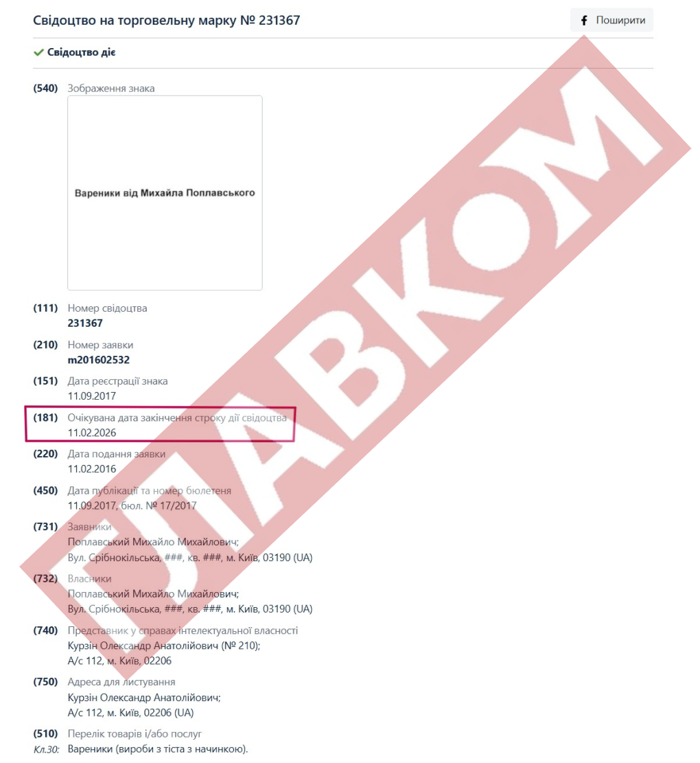 Окрім м’ясної продукції, закінчився термін реєстрації і для одного з найбільш впізнаваних брендів артиста – «Вареники від Михайла Поплавського». Дата завершення строку дії – 11 лютого 2026 року.