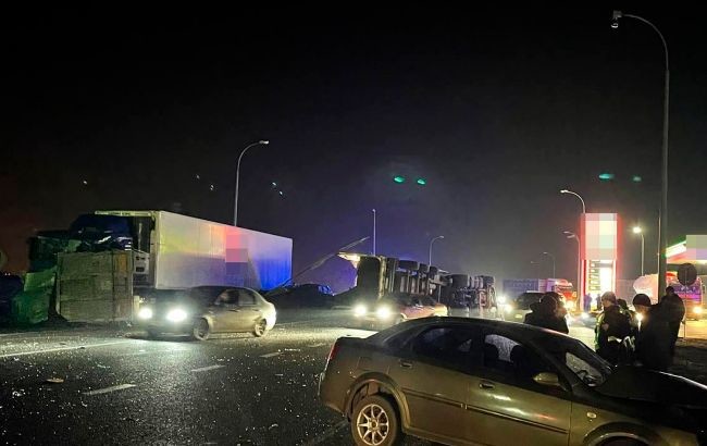 За попередніми даними, у ДТП потрапили три легкових автомобілі й дві вантажівки, одна з яких розчавила таксі.
