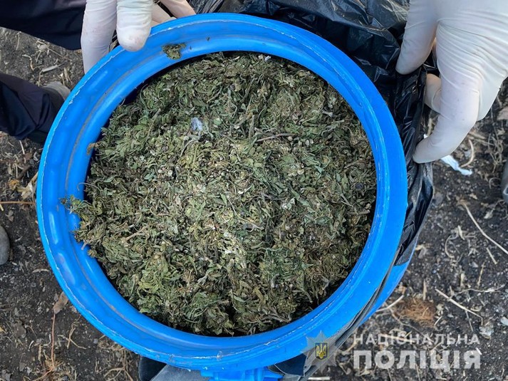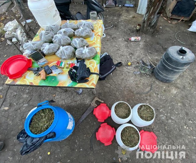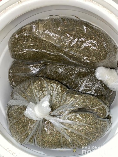 - 70 кг канабісу, що зберігався в 5 пластикових бочках і 12 поліетиленових пакетах;