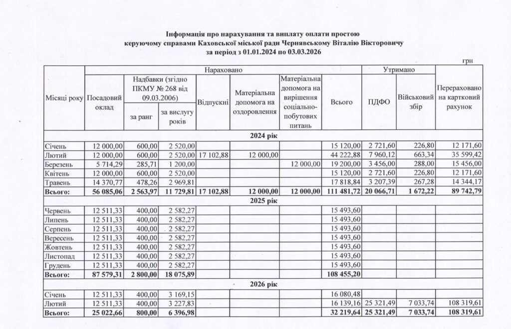 Раніше Каховська міська військова адміністрація призупинила з ним трудові відносини, проте суди попередніх інстанцій стали на бік колаборанта, визнавши рішення адміністрації незаконним. Начальник Каховської міської військової адміністрації Віталій Немерець заявив, що гроші Чернявському дійсно нараховували і є оплатою простою з червня 2025 року по лютий 2026 року.