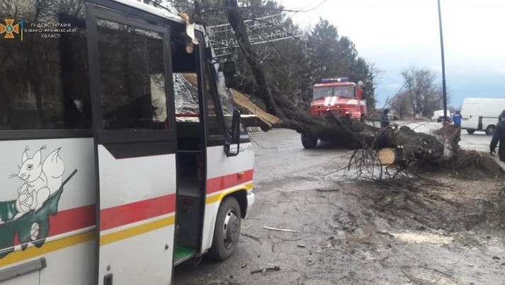 У Бурштині сильний вітер повалив дерево на маршрутний мікроавтобус, який перебував на стоянці. На щастя, жертв та постраждалих немає.