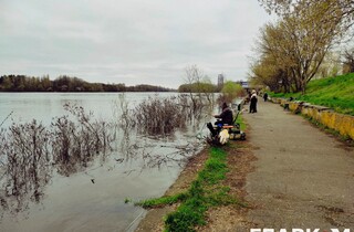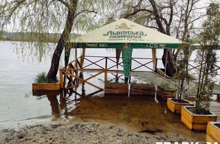 Вода досягає альтанок, розташованих на березі Дніпра. Рибалки ж користуються можливістю та ловлять рибу на березі річки.