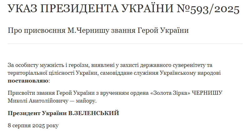 Так, звання Героя отримав майор Черниш Микола Анатолійович.