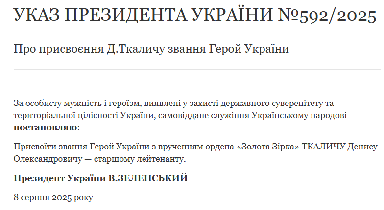 Також звання Героя отримав старший лейтенант Ткалич Денис Олександрович.