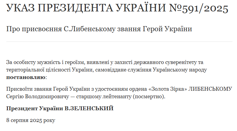 Володимир Зеленський присвоїв звання Герой України Либенському Сергію Володимировичу – старшому лейтенанту (посмертно).