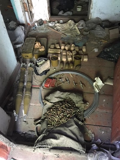 Зі схованки вибухотехнічним підрозділом ДСНС вилучено 800 грамів тротилу, понад 2 тисячі набоїв калібру 5,45 мм, 101 набій калібру 7,62 мм та 80 набоїв - 12,7 мм. Також три гранати Ф-1, гранату РГД-5, два постріли від РПГ-7 та дві тротилові шашки загальною вагою 600 грамів.