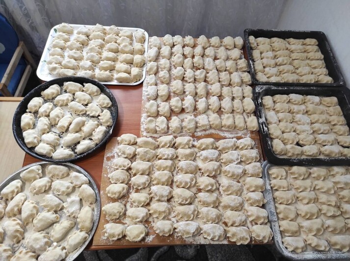 «На моїх плечах готування начинки й розкачування тіста. Донька й дружина ліплять вареники. Іноді і я підключаюсь. А так, то варю печінку, чищу цибулю, варю і товчу картоплю. Це почалося після Пасхи. Моя донька до цього ще возила по Черкасах безкоштовні обіди для літніх людей», – повідомляє чоловік.