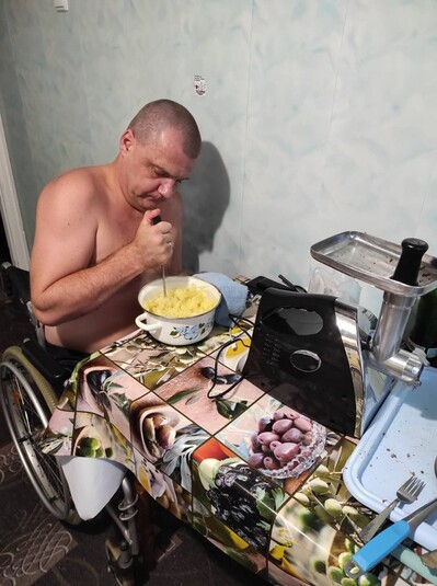 Євген Компанець одинадцятий рік прикутий до інвалідного візка. У 2011-му році впав з висоти на роботі. Працював головним комірником у мережі будівельних магазинів. Каже, пішов би воювати, якби не травма. Тому вирішив долучитися захищати країну, годуючи військових.
