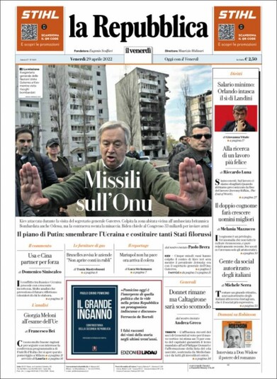 «Ракети в ООН» – заголовок на фото в La Repubblica. «Київ зазнав нападу під час візиту генсека Гутерріша. Під удар потрапив населений пункт біля посольства Великобританії. Одесу теж бомбили, але зенітна артилерія запобігла загрозі.