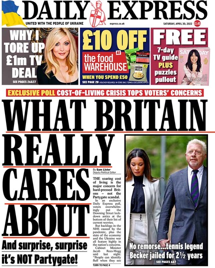 «Що реально турбує британців» про це на першій сторінці Daily Express. Стаття про опитування, яке показало, що «стрімке зростання вартості життя» є найважливішою проблемою для громадськості, а не скандал на вечірках партій. Газета повідомляє, люди кажуть, що виключення партій та посадових осіб із уряду перебувають «наприкінці списку» їхнього занепокоєння, а стан економіки та війна в Україні – усе ще вважаються нагальнішими проблемами.