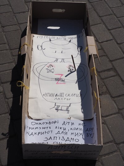 У Херсоні на мітингу проти російських агресорів люди спорудили труну із зображенням президента країни-агресорки РФ Володимира Путіна.