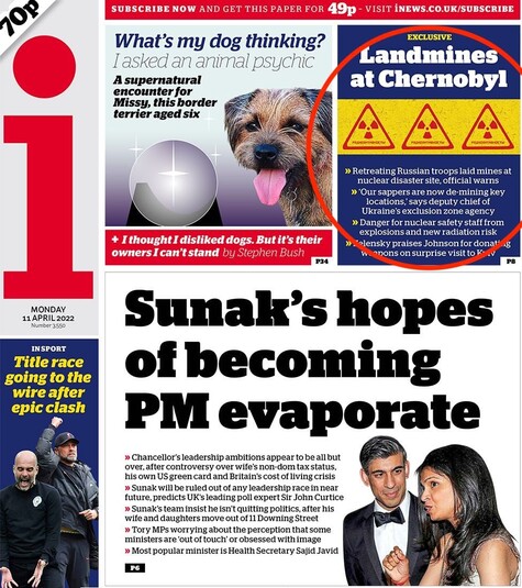 Видання І повідомляє, що російські війська заклали наземні міни у Чорнобилі, коли відступали. Експерти повідомляють газеті, що небезпека, яку становлять міни, вплинула на життєво важливі роботи із забезпечення безпеки на об'єкті і може призвести до того, що радіоактивний матеріал, який нині дрімає у ґрунті, буде розсіяний в атмосфері у разі вибуху.