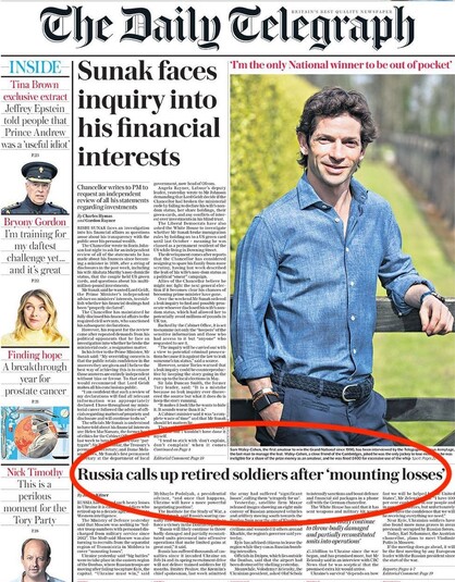 Британська The Telegraph, наводить заяви Міністерства оборони про те, що Росія вдалася до вербування відставних солдатів для підтримки своїх військових дій, зазнавши великих втрат у військах. Міноборони також повідомило газету, що Москва вербує персонал із сепаратистського регіону Молдови для посилення своїх сил.