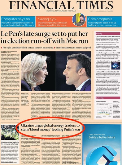 Financial Times зосереджується на закликах до торговців енергоносіями робити більше, щоб зупинити військові дії Москви, а українські офіційні особи звинувачують деякі з найбільших міських фірм у тому, що вони допомагають Кремлю перекачувати криваві гроші.