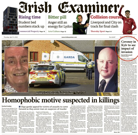 Ірландія, газета Irish Examiner: «Міністр Ковені у Києві побачить наслідки вторгнення».