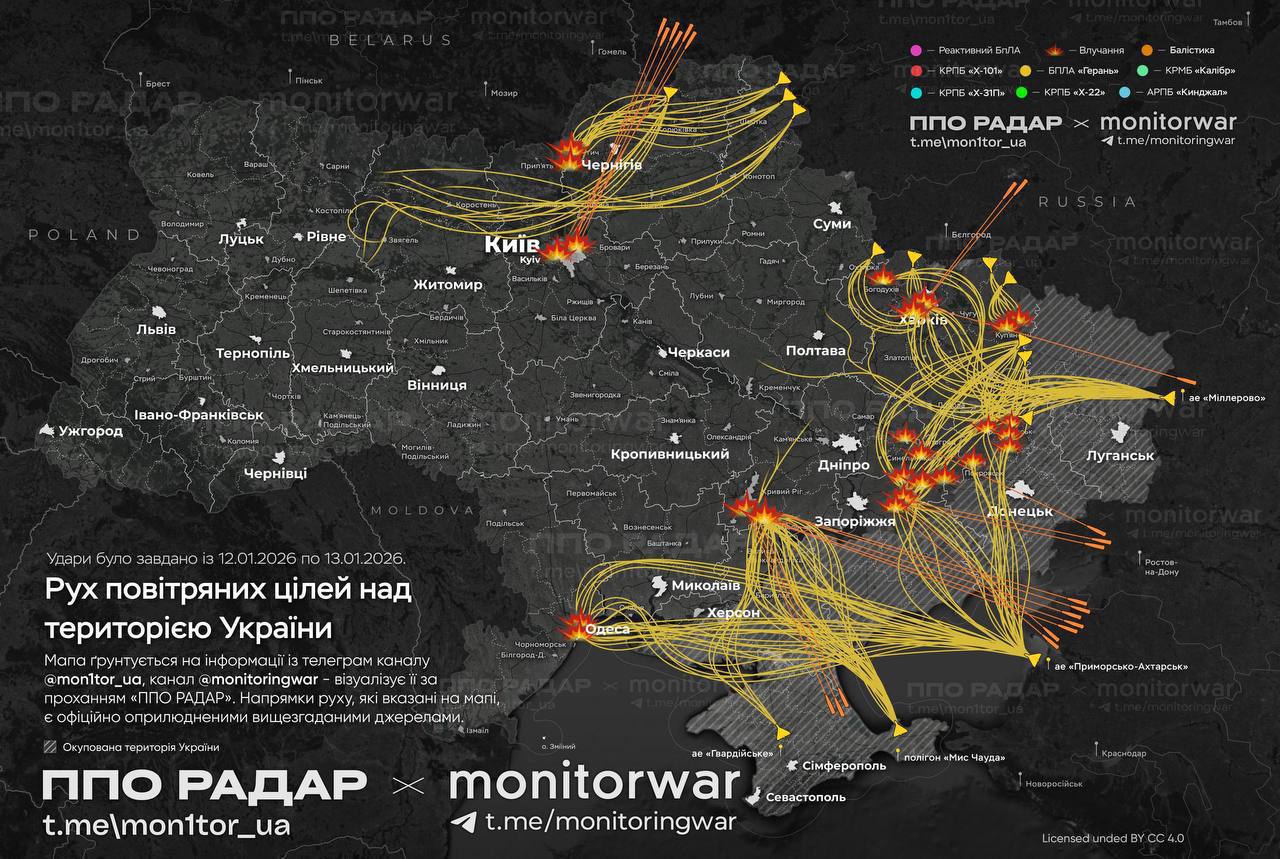 Російські загарбники 13 січня били по Україні балістичними ракетами та ударними дронами. Telegram-канал «ППО радар» оприлюднив мапу приблизного руху ракет та дронів під час атаки, передає «Главком».