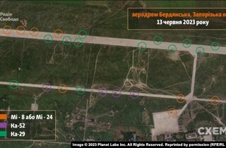 Росіяни на тлі початку контрнаступу Збройних сил України на Запорізькому напрямку перекинули 20 військових гелікоптерів на аеродром у тимчасово окупованому Бердянську Запорізької області. Про це повідомляє проєкт «Схеми» («Радіо Свобода») з посиланням на супутникові знімки Planet Labs за 13 червня.