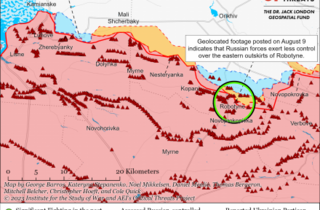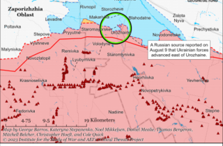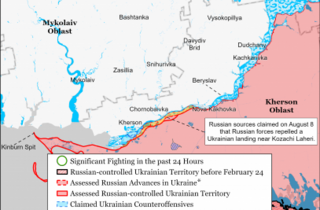 Кадри, опубліковані 9 серпня, ще більше підтверджують оцінки ISW про те, що українська атака поблизу Козачих Лагерів на східному (лівому) березі Херсонської області 8 серпня, ймовірно, було обмеженим рейдом. Маляр заявила, що український Генштаб і українські військові не підтверджують інформацію про перехід українських сил через Дніпро.