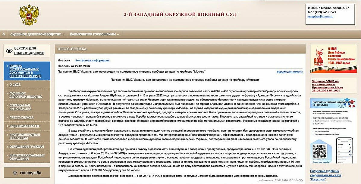 Цей факт виплив під час заочного засудження командира 406-ї бригади ВМС України до довічного ув'язнення. У тексті вироку було чітко вказано, що 13 квітня 2022 року саме ракетний удар спричинив критичні пошкодження, пожежу та подальше затоплення флагмана. Хоча публікацію поспіхом видалили з сайту суду, журналісти встигли зафіксувати докази цього «сейсмічного» зсуву в офіційному наративі.