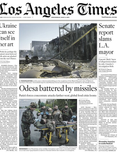 Los Angeles Times. Колонка справа: «Україна бачить себе в її мистецтві». Твори, мабуть, найулюбленішої народної художниці країни, вирвані з вогню війни.