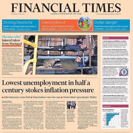 «Поранених вивезли з Маріуполя» – заголовок The Financial Times. Також на першій шпальті фото моменту евакуації бійців полку «Азов» зі сталеливарного заводу у Маріуполі.