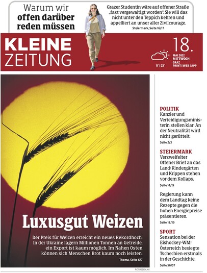 Kleine Zeitung. Ціна на пшеницю б'є новий рекорд. В Україні зберігаються мільйони тонн зерна, експортувати його навряд чи можливо. На Близькому Сході людям вже важко дозволити собі купити хліба.