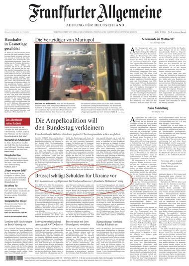 Frankfurter Allgemeine Zeitung: «Захисники Маріуполя». Підпис під фото: «Кінець Опору? Понад 260 українських військових залишили азовський металургійний завод у Маріуполі після кількох тижнів блокади. Повідомляється, що десятки людей серйозно поранено. Їх доправили до лікарні у підконтрольному Росії місті Новоазовську. Інші солдати імовірно перебувають у місті Оленівці – у російському полоні. Президент України Володимир Зеленський заявив у вівторок: «Україні потрібні її герої живими», а їхнє повернення додому вимагатиме «такту та часу».
