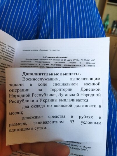 Водночас один із військових публікує інформацію про те, що всім, хто виконує задачі під час спеціальної військової операції на території так званих «ДНР», «ЛНР» та в інших областях України, виплачуються два оклади відповідно до військової посади щомісяця та 53 долари за добу.