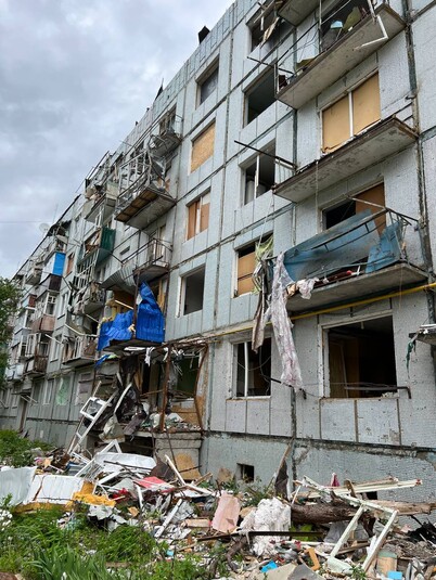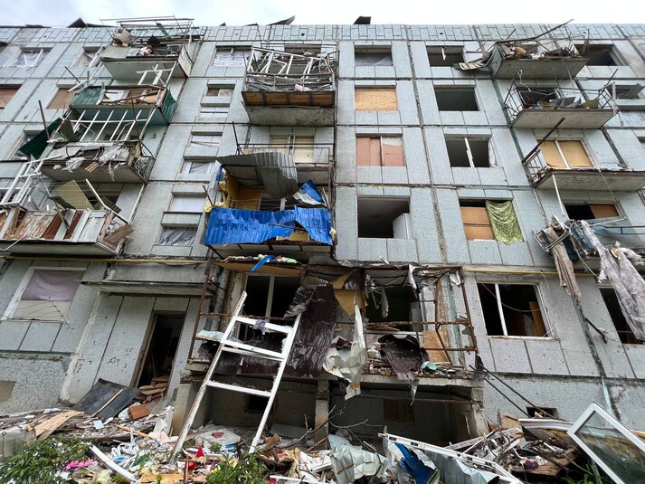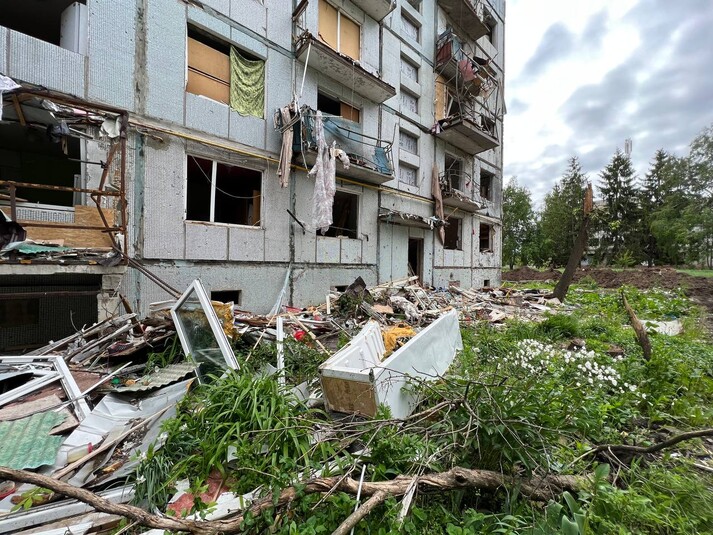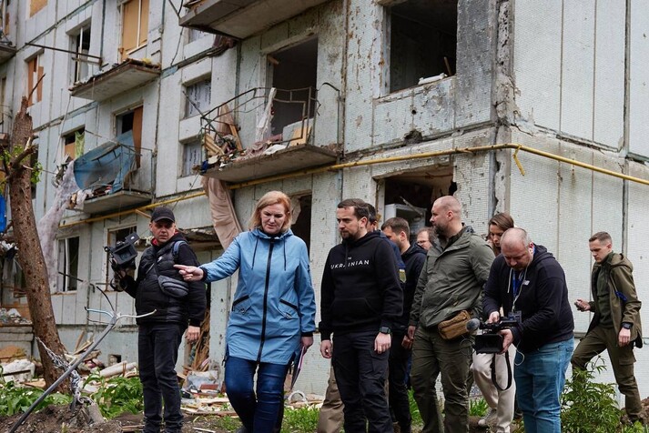 Заступник керівника Офісу президента Кирило Тимошенко побував у місті Чугуїв, що на Харківщині – оглянув зруйновані в перший день війни багатоповерхівки.