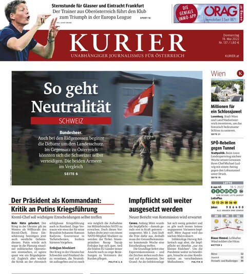 Kurier: «Президент як полководець: критика путінської війни». Кремлівський бос сам ухвалює найважливіші рішення. На Заході війна в Україні розглядається як свавілля кремлівського боса. Цю оцінку наразі підтверджують і західні спецслужби. Путін навіть втручається у планування окремих військових операцій, діючи як бригадний генерал.
